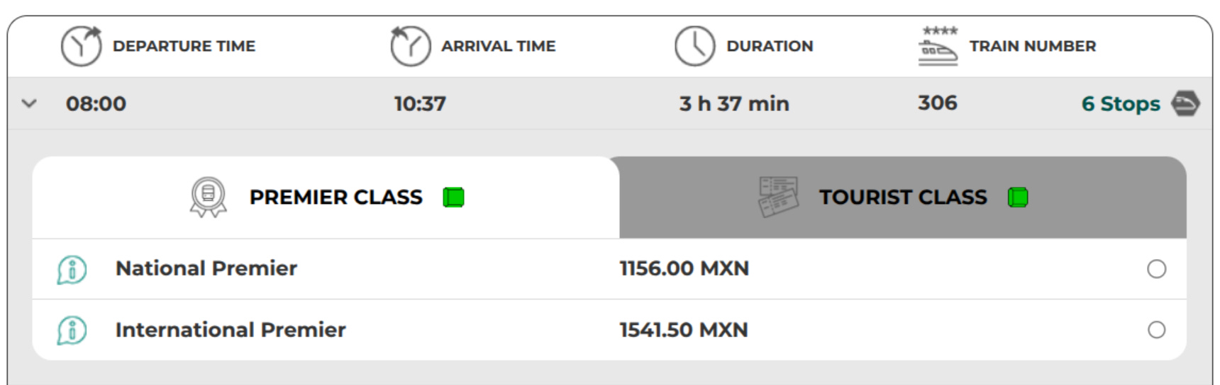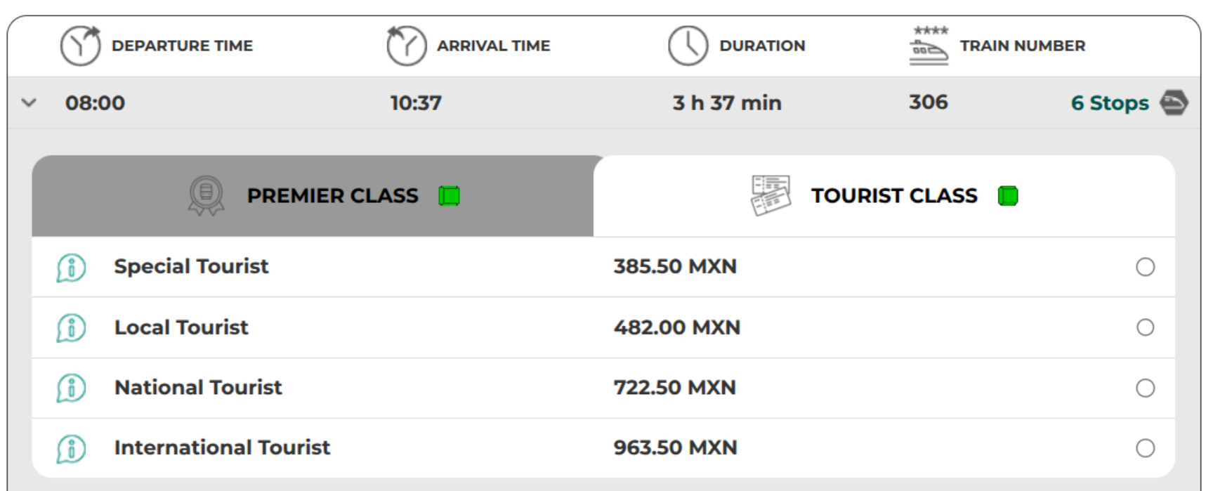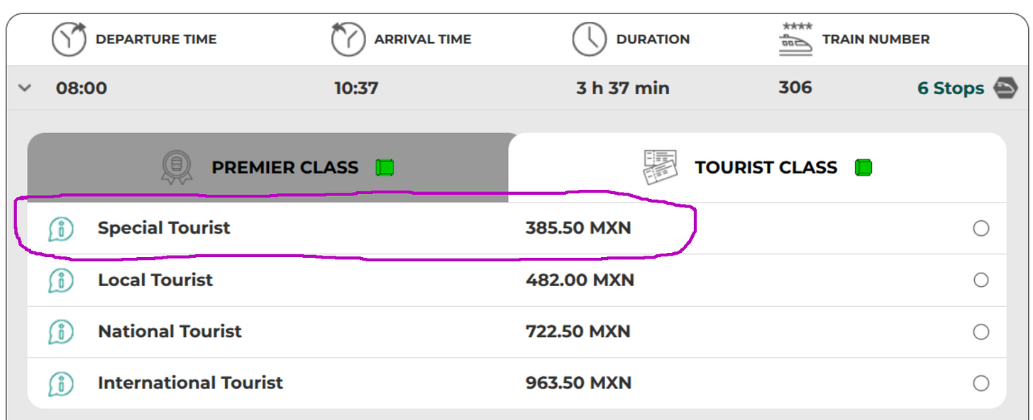 This price is the lowest price at 385 pesos and legal residents can take advantage of this if they have an INAPAM discount card for seniors and disabled people. The reason why this price category is honored even for foreigners is complex but it comes down mostly to treaties and reciprocal agreements. If one country gives another discounts for seniors then it's common for the other to reciprocate. If you are a legal resident of Mexico and are 60 years or older you can apply for this card and get very cheap prices on the train as well as discounts for other things. https://www.mexperience.com/inapam-mexicos-discount-card-for-seniors/